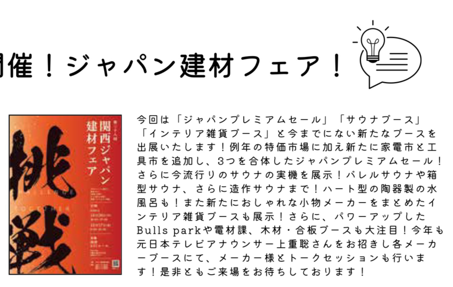 10月16日(木)~17日(金)「第38回関西ジャパン建材フェア@大阪南港ATCホール」に出展いたします。ByYusukekubomi@gmail.comCategoriesInお知らせ, ココロサウナPosted onOn2025 10月 12 今回はサウナブースが企画され、当社に出展依頼のお声がかかりました。 屋外用サウナ、屋内用サウナ(2人用)、水風呂(S)、陶器製ハート型浴槽、ととのう狸の傘立てが展示されます。 屋内用サウナ、水風呂については、住宅に設置しやすいような小型化された製品を展示いたします。 今後は、滋賀県の信楽焼産地の製品群の販売もスタートしていきます。 よろしくお願いいたします。